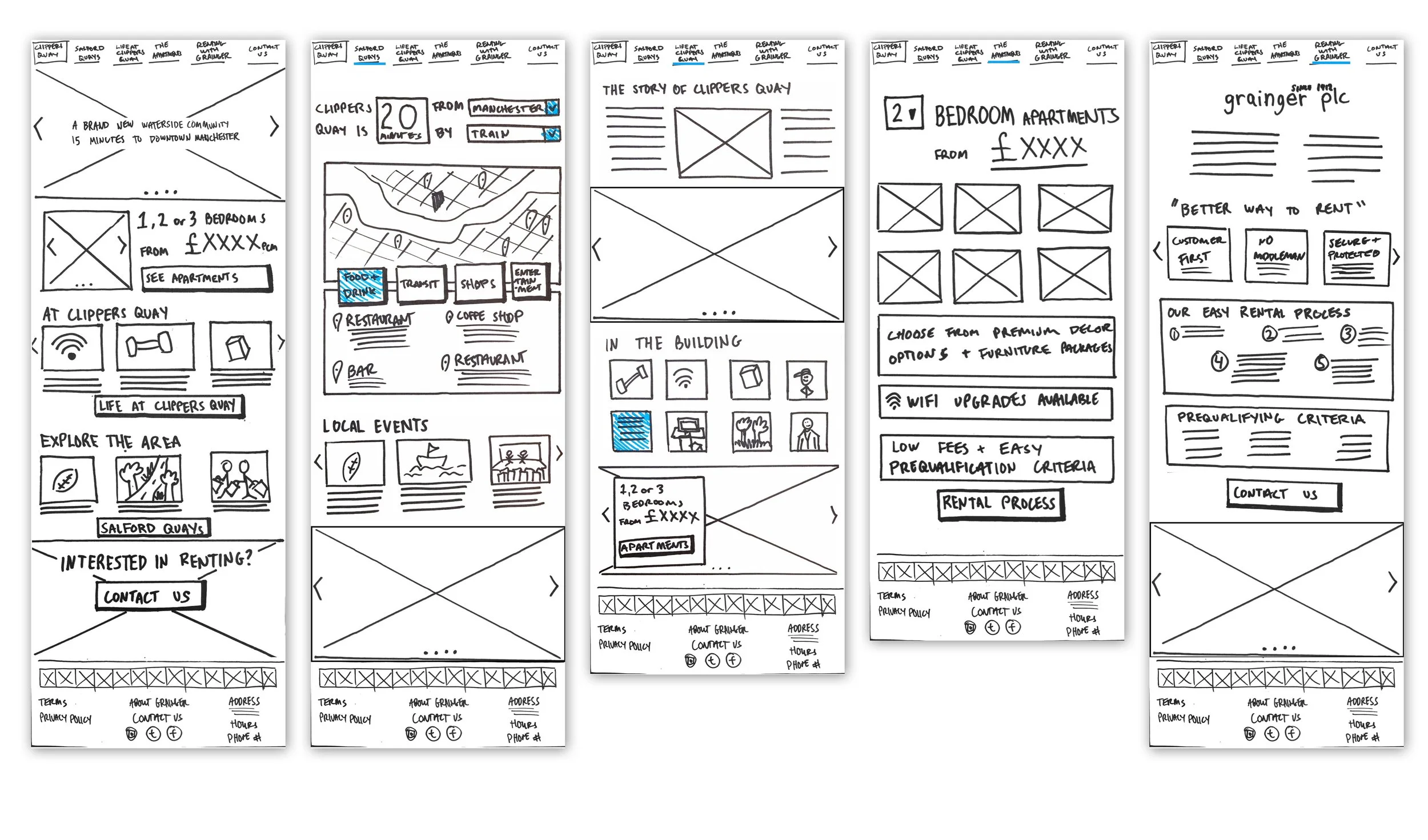 Initial organization of elements per page, created with input from stakeholders. Later consolidated the neighborhood and building sections into one "Living at Clippers Quay" page. Also combined Renting Logistics and Grainger pages into one "Renting with Grainger" page outlining the benefits of renting with Grainger and the easy rental process.