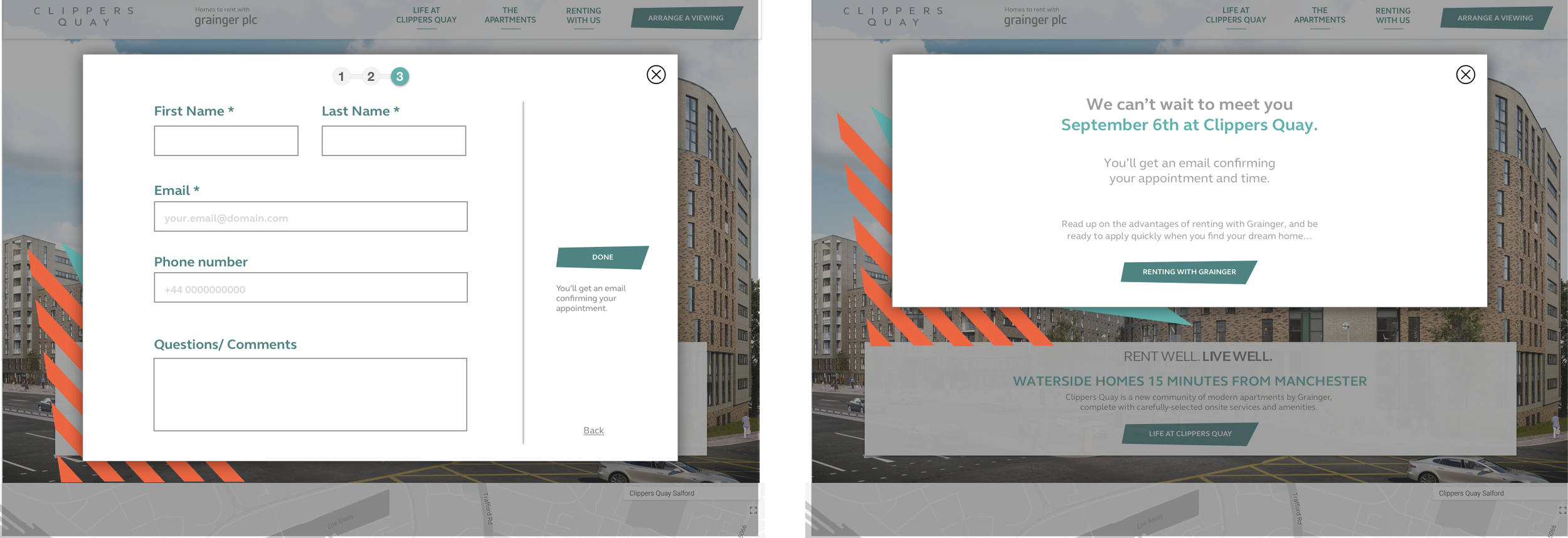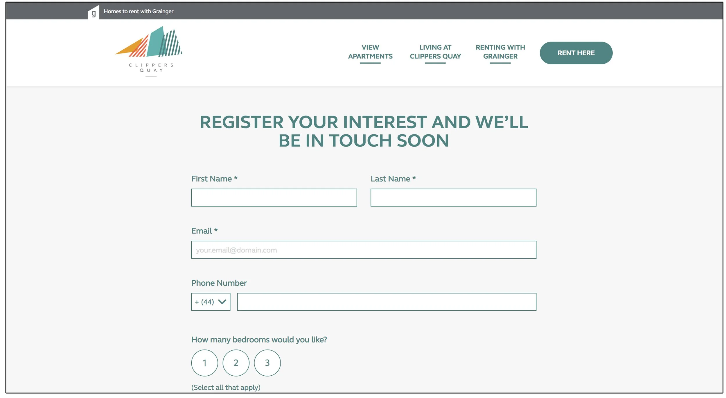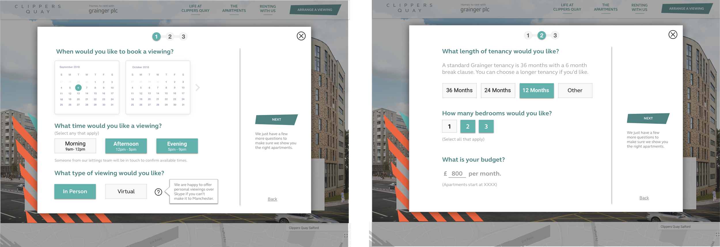 Once the building is open and ready to show the apartments, register your interest will become "Arrange a Viewing" with options to choose different apartment types, number of bedrooms, length of tenancy, and then schedule a time to see it within a 3-step process: