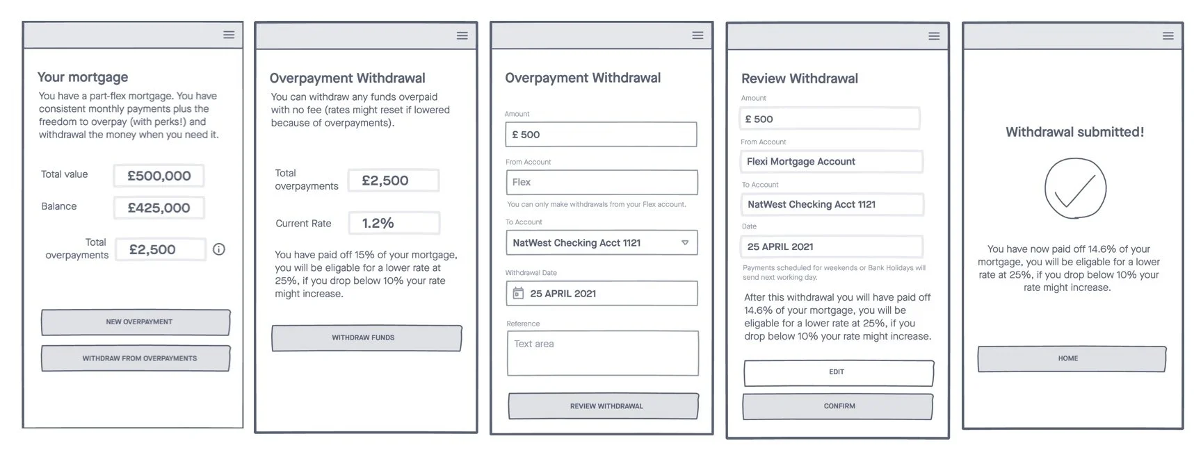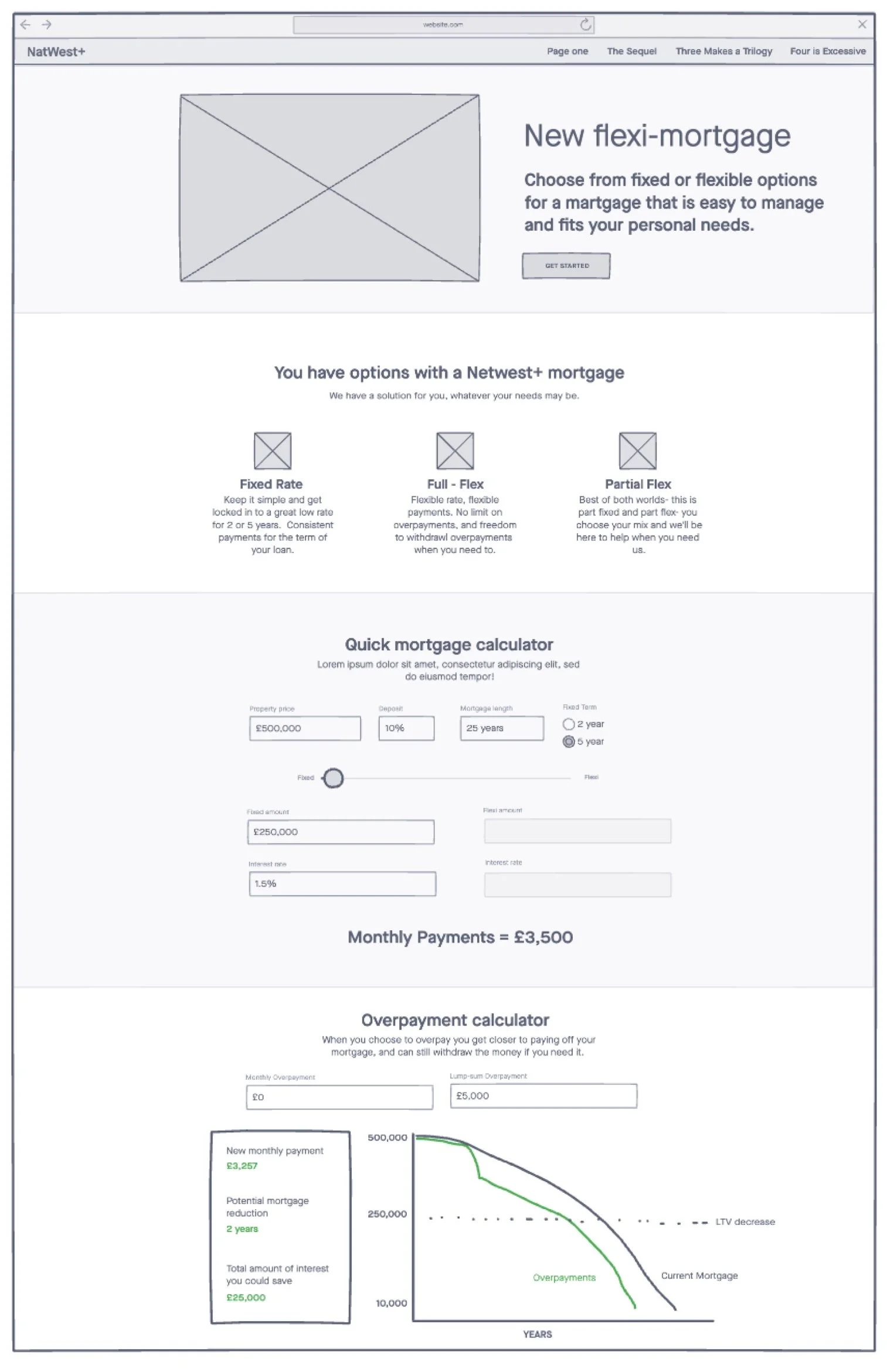 I worked with the new business propositions team to create a low fidelity prototype of an idea for flexible mortgages, used for testing and validating with the new business team.