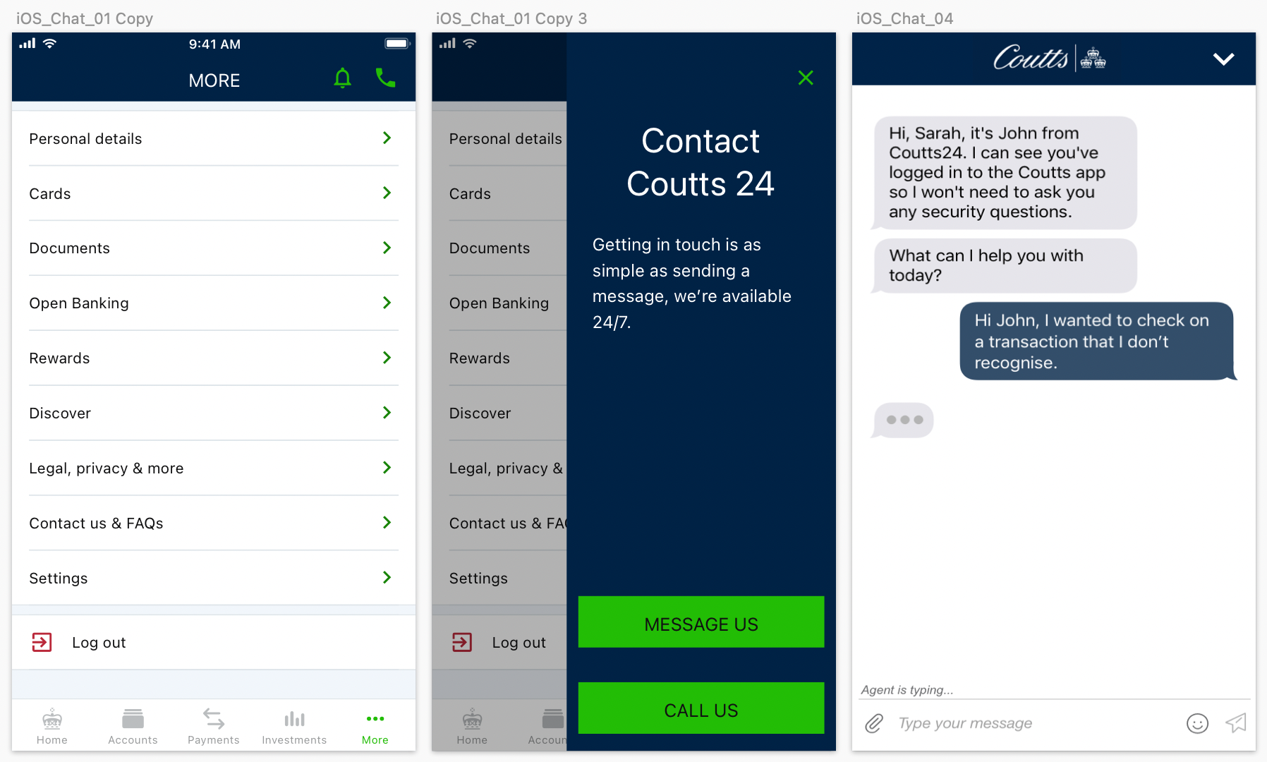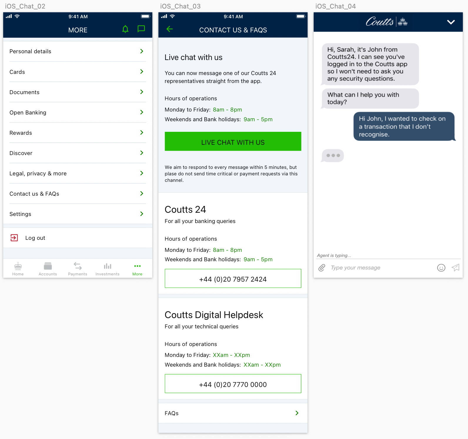 Below shows a new feature that allows customers to initiate a live chat in-app. There were multiple entry points to contact Coutts, plus the brand new live chat option that could be reached from the Contact Us screen, or directly from most app screens.
