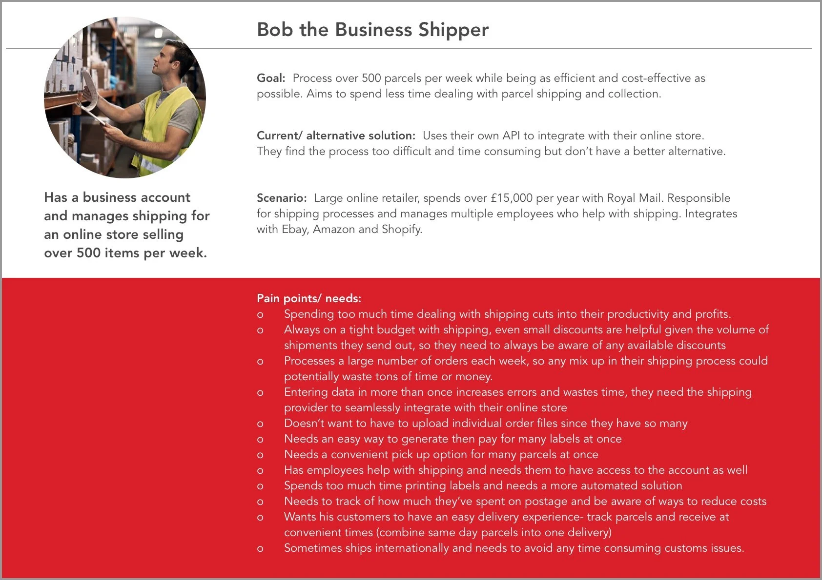 Three main personas were identified as the target users for this feature- guest shippers, frequent shippers, and business shippers. All had varying needs and requirements throughout the process of creating the shipment but similar goals in the end- to easily and efficiently ship packages.
